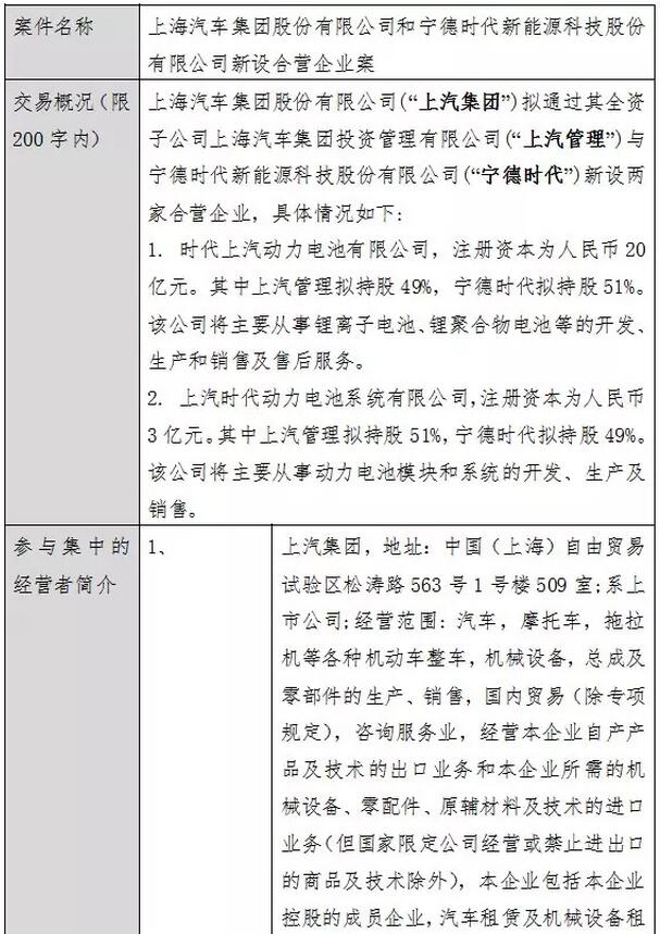 近日,商务部反垄断局官网经营者集中简易案件公示中显示,上海汽车集团股份有限公司(“上汽集团”)拟通过其全资子公司上海汽车集团投资管理有限公司(“上汽管理”)与宁德时代新能源科技股份有限公司(“宁德时代”)新设两家合营企业,分别为时代上汽动力电池有限公司与上汽时代动力电池系统有限公司,公示期:2017年5月4日至2017年5月13日。