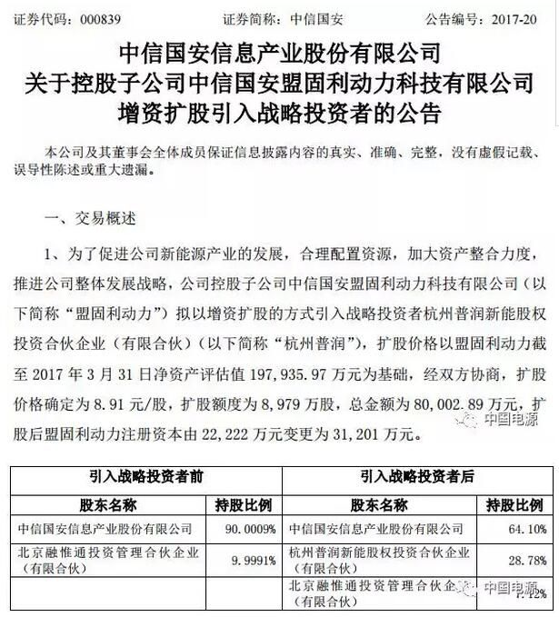 5月19日晚间,中信国安发布公告称,控股子公司中信国安盟固利动力科技有限公司(以下简称“盟固利”)将以8.91元/股的价格,扩股8979万股,总金额达8亿元,引入战略投资者杭州普润新能股权投资合伙企业(有限合伙)(以下简称“杭州普润”)。扩股后盟固利注册资本由22222万元变更为31201万元。