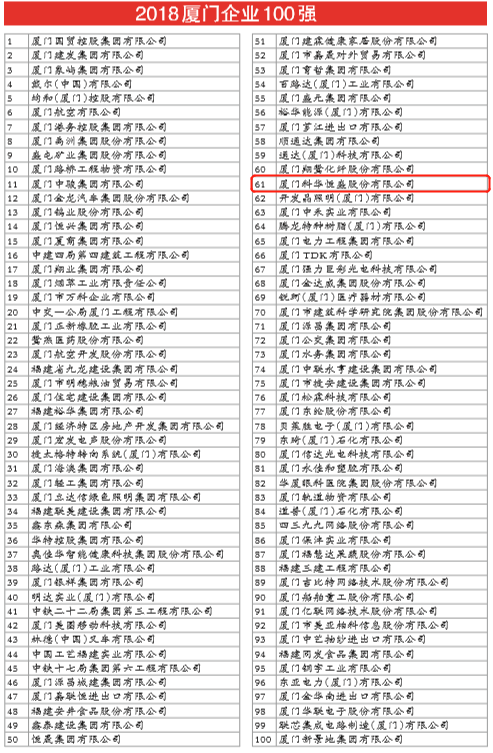 在此次评选中,科华恒盛荣登“2018厦门企业100强”及“2018厦门新兴产业专精特新企业10强”两个榜单。