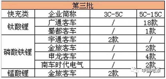 分批次来看,第一批目录4款快充类纯电动客车,搭载的动力电池全部为锰酸锂电池;第二批目录5款快充类纯电动客车,搭载的动力电池全部为磷酸铁锂电池;第三批目录中,钛酸锂来势汹汹,磷酸铁锂的快充类车型提升较快。总体来看,近期多元化的路线选择有利于快充类动力电池的技术提升。