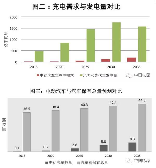 如果我们抛开发电与充电时间匹配的问题不谈,假设他们能完美匹配,那么电动汽车充电能耗能帮助消纳多大比例的可再生能源发电呢?图二描绘了英国电网对于未来二十年风光发电总量和电动汽车充电需求的预测[1]。我们可以注意到,即便到2035年,电动汽车能耗总量也只相当于风光发电总量的18%。那么这么低的数字是否是由于电动汽车普及速度较慢造成的呢?其实不然。图三对比了未来电动汽车增长数量[1]以及英国总汽车保有量(考虑1%的年增长率)。我们可以注意到到2035年,电动汽车保有量可达到八百三十万辆,且占了汽车总量的约20%。这个普及程度的预估应该可以说是绝不保守的。所以在如此大的电动汽车数量前提下,即便不考虑充发匹配,其所带来的增加负载对消纳可再生能源发电的作用也应该来说是比较有限的。