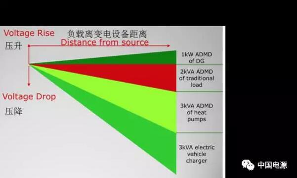虽然电动汽车能够一定程度上帮助消纳可再生能源。但是其充电活动所带来的功率增长也会给电网带来挑战。首当其冲的便是配变电设备的扩容要求。在居民社区使用典型的3kVA到7kVA充电桩会增加局域电网负载。尤其考虑到车主的充电习惯是下班回家后便插上电源开始充电,那么在无控制的前提下配电网必然会迎来一段充电高峰。然而英国电网在早期设计和铺设线路时,并未考虑未来会出现如此高密度的负荷增长,其所评估的用户分集后最大电力需求仅为2kVA每户,如图四所示[2]。我们可以注意到电热泵和充电桩所带来的增加负载会极大程度增加配电网的压降,导致终端用户电压过低和电网运行不稳定等问题。所以充电桩的部署可能会导致配电网设备在设计寿命未到之前便被要求更换,从而导致资产投资回报低于预期。
