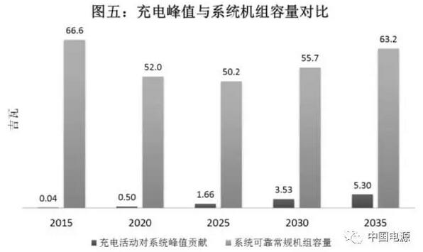当然,不光配电网会受到这种“整齐划一”的充电行为所影响,发电侧也会受到一定程度的冲击。从图一中我们其实就可以注意到充电的主要时间是集中在18:00-24:00,而这也与系统高峰时段相重合。图五就对比了英国未来二十年的充电活动对于系统峰值增加的贡献以及系统内可靠机组的总容量[1]。可以发现,在像英国这种富余机组不多的系统中,充电所带来的额外峰值到2035年可占机组重容量的8.4%。这也让英国政府在进行能源规划时不得不考虑增加可靠常规机组,以应对不断上涨的系统需求,保证系统安全运行。