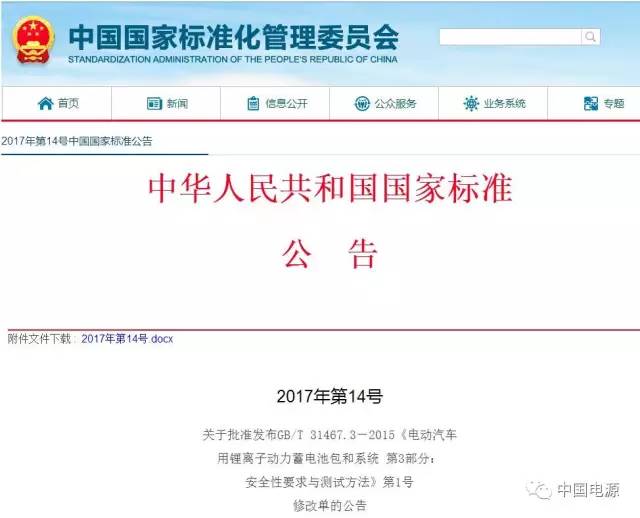 2017年6月6日,国标委发布2017年第14号文件,批准发布GB/T31467.3-2015《电动汽车用锂离子动力蓄电池包和系统第3部分:安全性要求与测试方法》第1号修改单公告,自2017年7月1日起实施。
