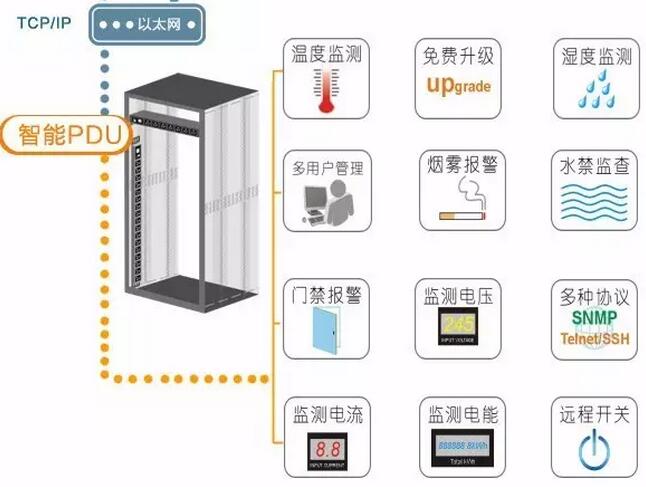 新一代智能PDU具备全功能的网络管理接口,集成远程监控和控制功能,能够通过Web、SNMP和Telnet提供基于标准的管理,允许用户从远程位置访问、配置和管理PDU,实时监测功能对电流、电压、功率、功率因数、电量、温湿度等数据进行监测和精细化管理,使管理员更好的获知PDU总用电量、各支路的状态,打开和关闭各单独插座及监控单独的插座及整体机架PDU,而USB接口用于外接WIFI,实现无线通讯,以及自身程序升级等。